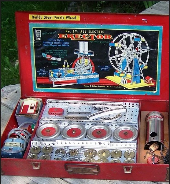 Na vožnji iz Connecticuta do New Yorka leta 1911 je Gilbert skozi okno vlaka opazoval, kako delavci nameščajo in kovičijo jeklene nosilce stolpa električnega daljnovoda. Tako se mu je utrnila zamisel za izdelavo otroškega gradbenega kompleta. To je bil sestav kovinskih nosilcev z enakomerno razporejenimi luknjami za vijake, vijakov, jermenic, zobnikov in motorjev.