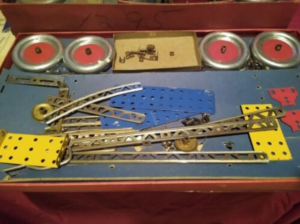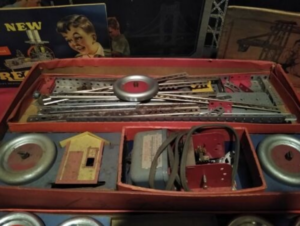 Na vožnji iz Connecticuta do New Yorka leta 1911 je Gilbert skozi okno vlaka opazoval, kako delavci nameščajo in kovičijo jeklene nosilce stolpa električnega daljnovoda. Tako se mu je utrnila zamisel za izdelavo otroškega gradbenega kompleta. To je bil sestav kovinskih nosilcev z enakomerno razporejenimi luknjami za vijake, vijakov, jermenic, zobnikov in motorjev.